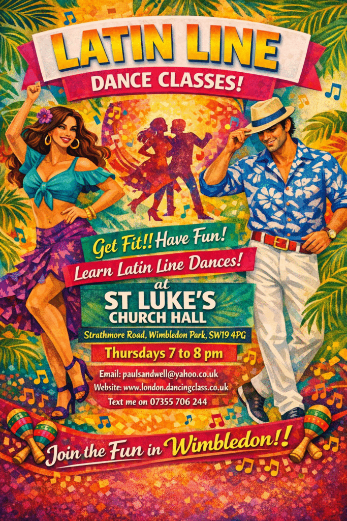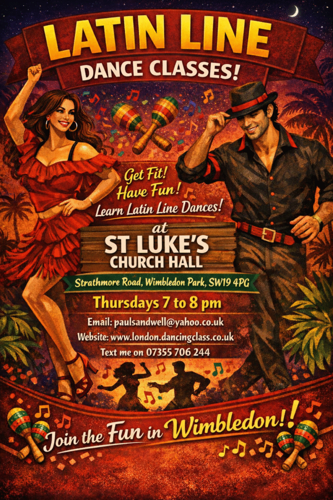 Why not try some solo Latin line dancing with routines set to Cha Cha, Rumba, Bosa Nova, Mambo, Samba, Jive, Paso Doble, Cumbia. Great for people that want to dance to these rhythms by themselves and set in a line dance type format. This is a vibrant dynamic dance class on Thursday evenings from 7-8 pm at St Luke’s Church Hall, Strathmore Road, Wimbledon Park. A drop in whenever you like class, each sessions is £12. More details paulsandwell@yahoo.co.uk or text 07355 706244